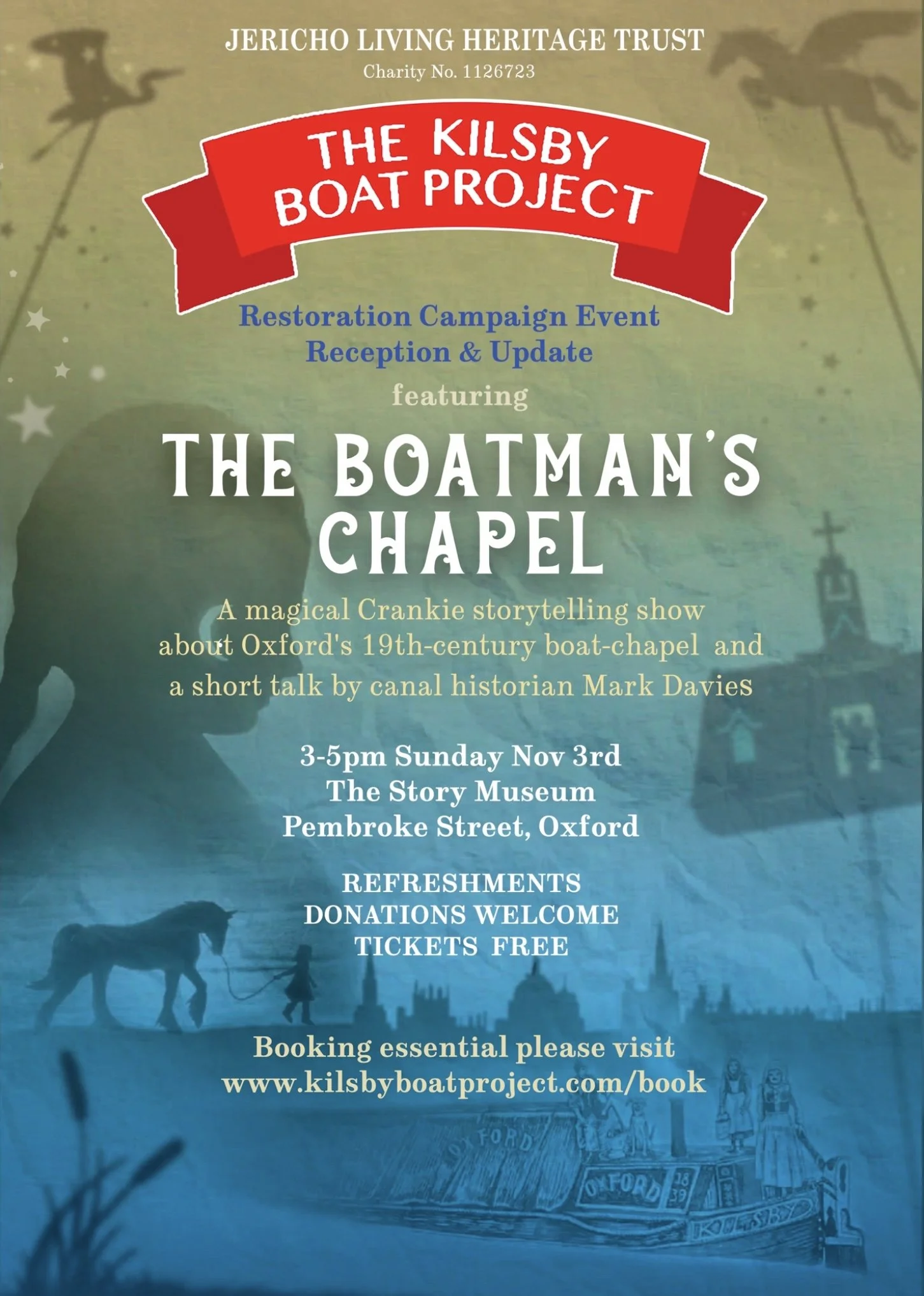 We presented the Floating Boatman’s Chapel Crankie as a film at Oxford’s Story Museum as part of a fundraising event for Kilsby Theatre Boat. We are hoping that this sort of storytelling entertainment will capture the imagination of those helping to restore Kilsby Boat, and that one day it could be performed aboard the boat theatre itself.