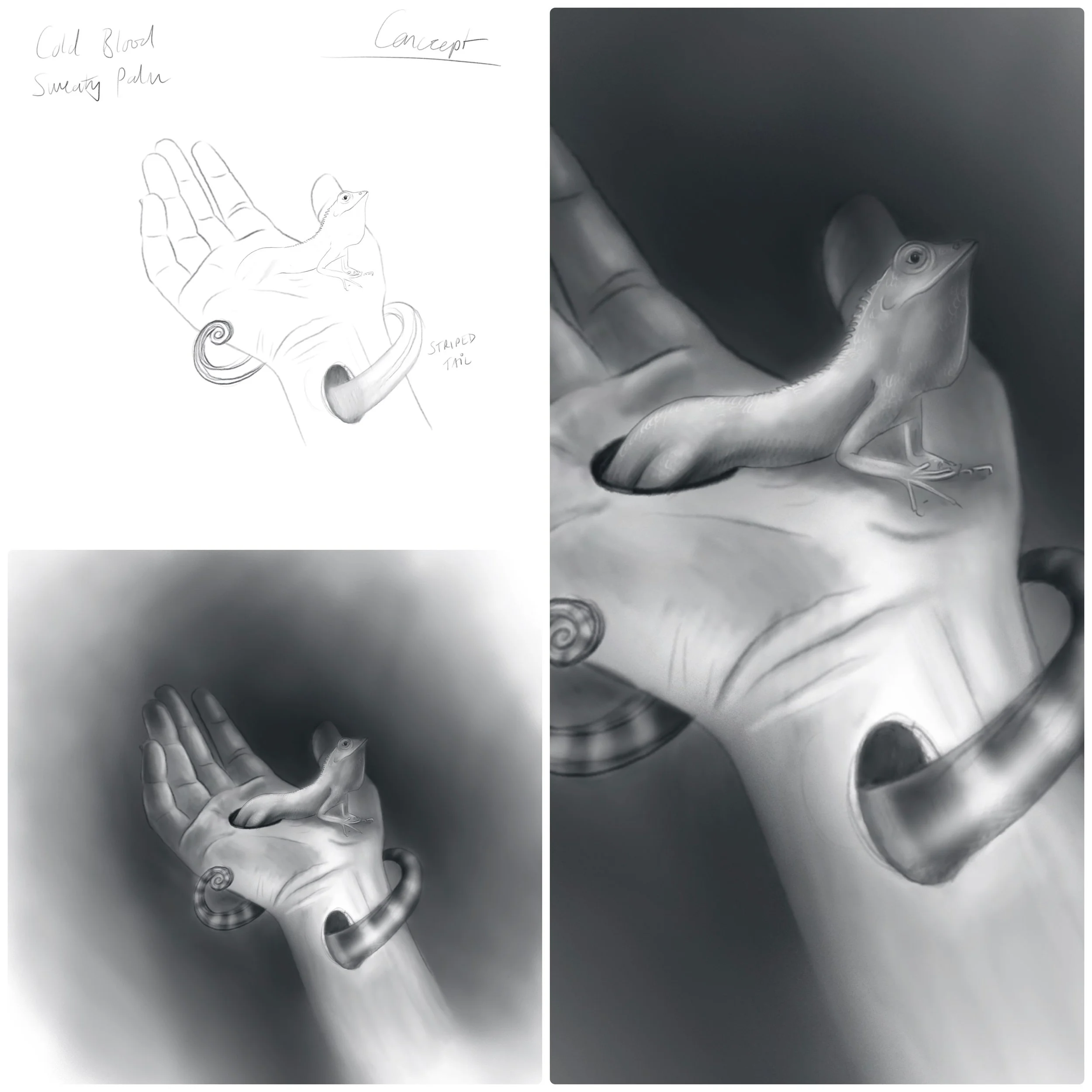 A quick concept sketch and poem beginnings on the theme of reptilian brain syndrome which appears to be taking over the world. Nice to focus on the monochrome and good practice-colour can often take an image somewhere else, I’m thinking eventually creating a little animation of the lizard crawling up through the palm, and transforming into flashing neons or something…..For now I want to get down the textures and the shapes and enjoy the contrast.