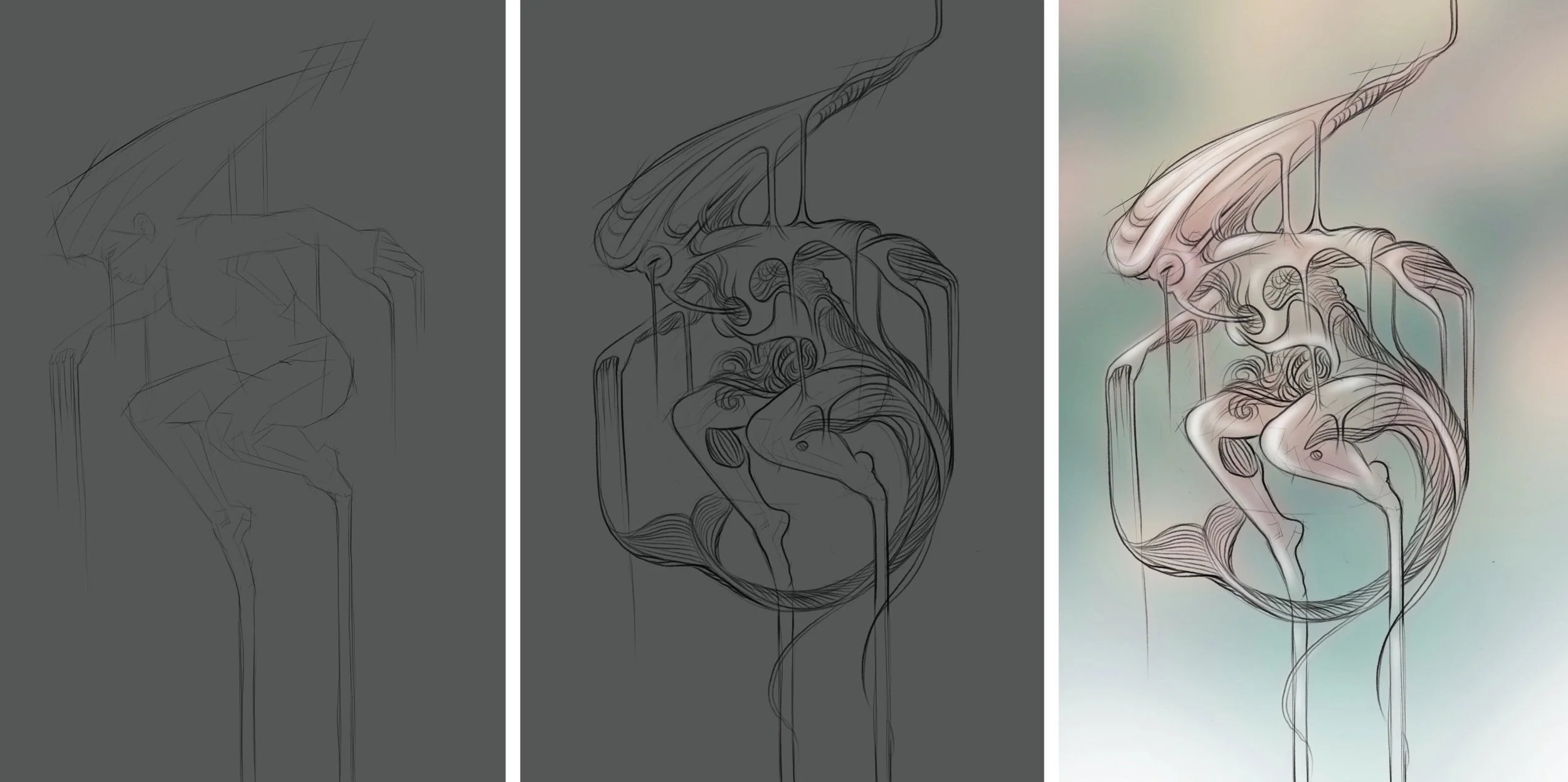 I began to adopt a practice last year, to encourage more play and instinctive results when it comes to concepts and sketching. In moments when I’m feeling tired or overwhelmed by workload or a deadline or a project yet to be conceptualised, I found I’d freeze and get nothing done. One of my creative procrastinations surprisingly became a meditative process and I now implement it as soon as I feel the paralysis creeping up. I allow myself between half an hour and an hour to draw something. Anything. There is no expectation and it doesn’t matter what ends up on the page. I am not allowed a reference, but there are no other restrictions. Once the time is up, the image can be tossed aside if I hate it. If there’s potential for development, perhaps I’ll save it for further work. Either way, it’s’ going into my imagination, conjuring up a thing. What I find during this activity is that I enter a flow state. I often manage to get into ‘the zone’ when I’m working in a hyper focused manner, but for these imaginative studies, it’s like a super quick propelled version of that. Perhaps it’s the nostalgia of drawing for fun which is what we do when we are kiddiwinks. Perhaps it’s the abandonment of ‘real work’ which transforms the task into a forbidden fruit, making it more tantalising. But it always has interesting results and it reignites the creative flame. Occasionally it’s the very act of procrastinating that suddenly jerks my brain into action and the illustration problem I’ve spent all day unable to solve, is magnificently apparent-hanging there in the disemboweled remnants of a cyborg siren. The takeaway is, as soon as I tell myself I’m blocked creatively-I have to intervene with a new angle and a new set of rules (or in this case no rules). I made a little timelapse of this strange concept sketch which grew from an instance of frustrated ’I am crap and I have no ideas’ syndrome. The moral of the story is, turn off the thinking and let the subconscious (and in my case, disturbed) cogs of your mind fix your deadlines for you.....