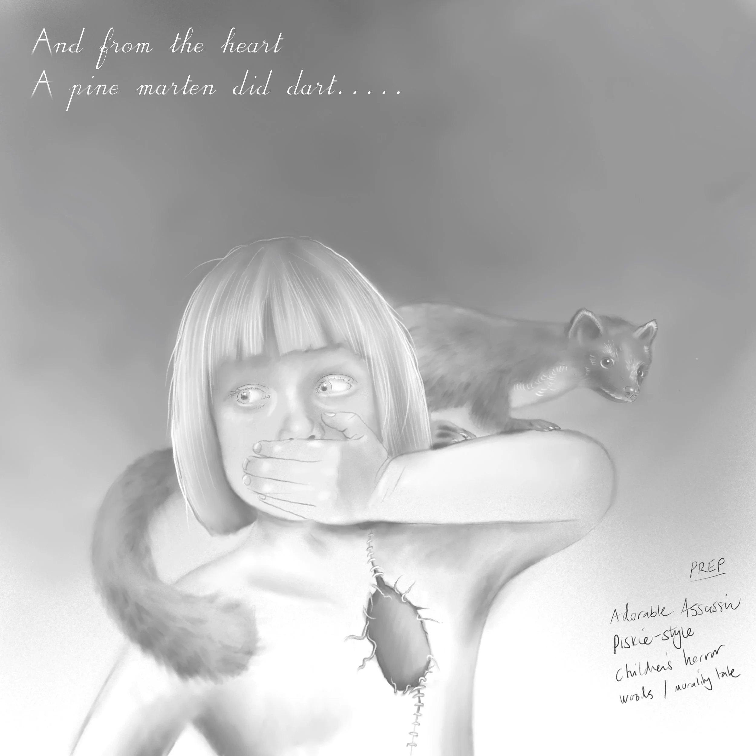 A storytelling concept- I’ve included my work so far.....which is a prep sketch. No further utterings on paper just yet, simply a visual which had to be scribbled down before it fled from the fleeting ‘odd but I like it’ catalogue I have flicking through my brain all day long. There is a girl and there is a pine marten. And there is a deep secret eating away at their joint soul.....