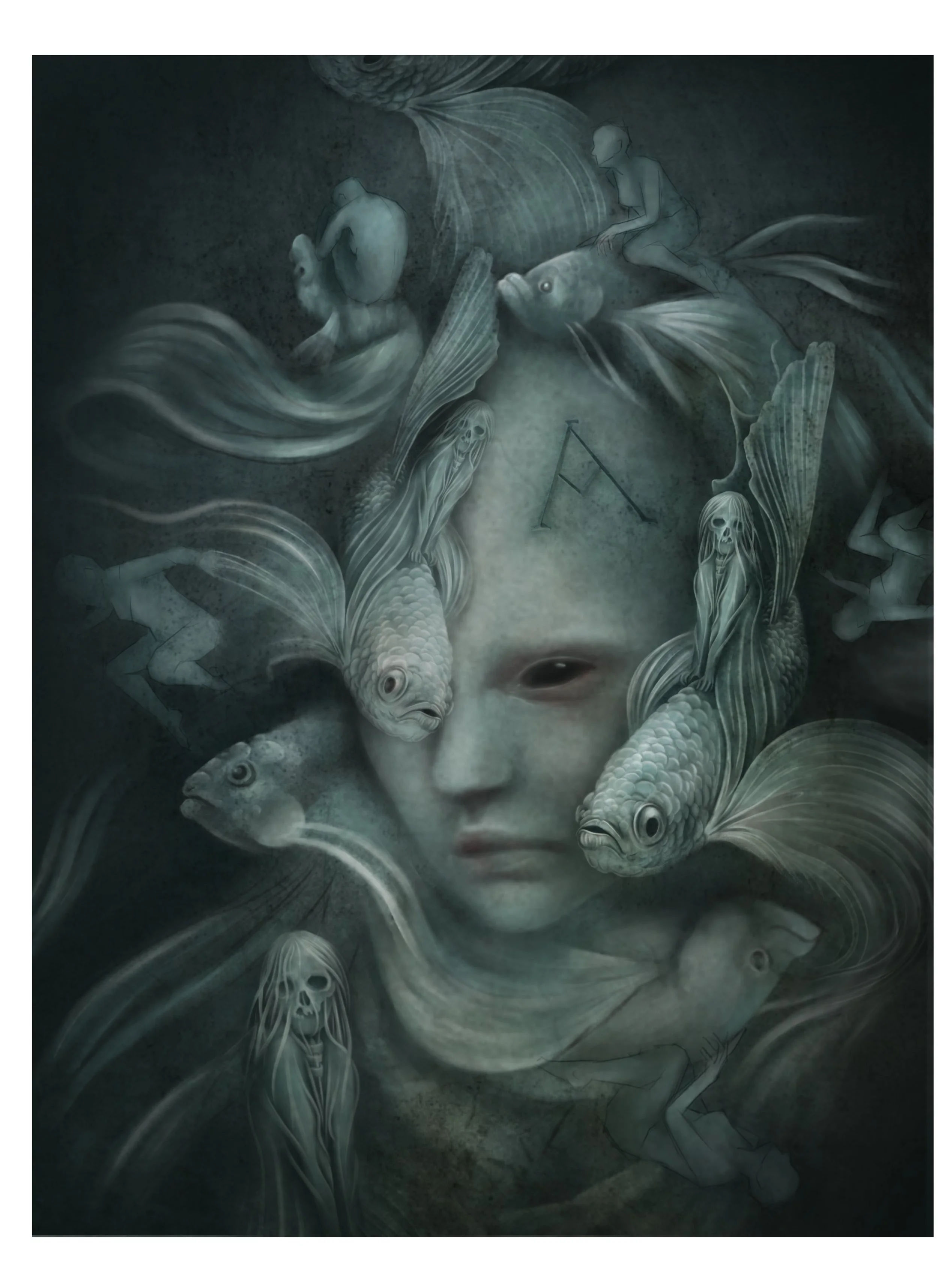 My painting is inspired by the idea of a river hag, but one with a tragic backstory.....having been thrown out of society and tested in the local river, Nelly sinks to the bottom of this deep stretch. It was common for women who commit adultery to be branded with the letter ‘A’ and have their head shaved. And this is what happened to Nelly.