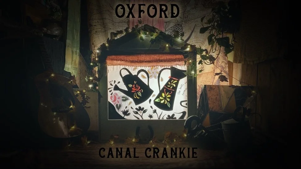 The Crankie Workshop encouraged groups of kids, or adults, to dive deep into their imaginations and help create elements for the Crankie Scroll to tell a story on a specific theme. I was invited to Oxford’s Science Wonder Garden Party in collaboration with Kilsby Theatre Boat project. We made shadow puppets, painted canal folk art, potato stamped horse hooves, sketched life through portholes and designed boats from the future. The art was collected up and made into a final scroll telling the story of the Oxford Canal, past, present and future, showcasing the participant’s artwork created on the day. I then filmed the performance, adding a song/soundscape and the production was accessed online for all workshoppers!.