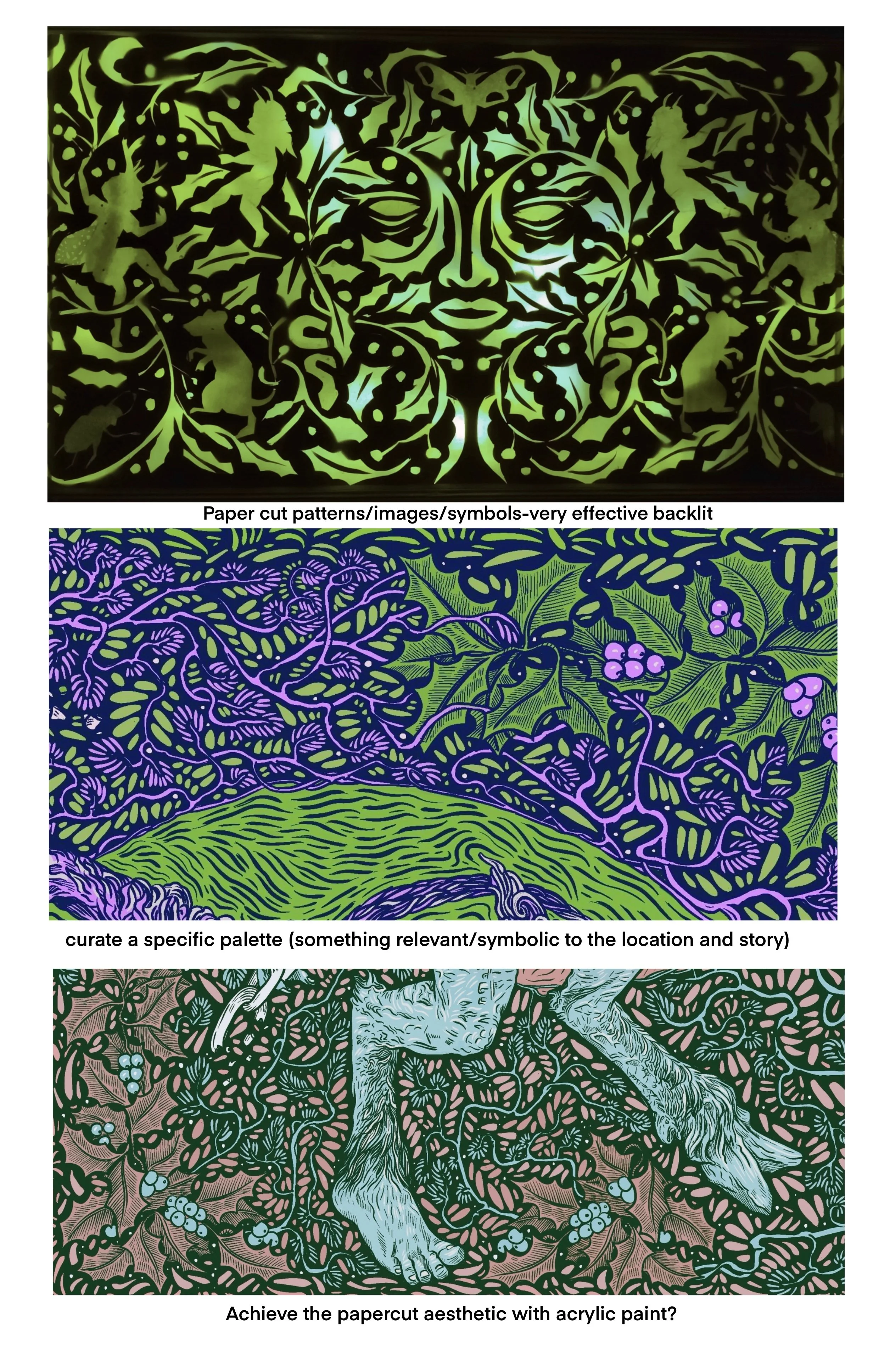 I’ve attached some ideas regarding my painting style/techniques which I think would work well at scale. The bold black illustrative style and the negative space paper cut out style both reflect a feeling of folk art which I think can be achieved . I imagine a curated colour palette/patterns or motifs and symbols we could employ as part of the scenery, to encapsulate a nostalgia of specific location or story. I’m open to all sorts of ideas and I’m pretty versatile with manipulating my style according to the overall desired aesthetic.